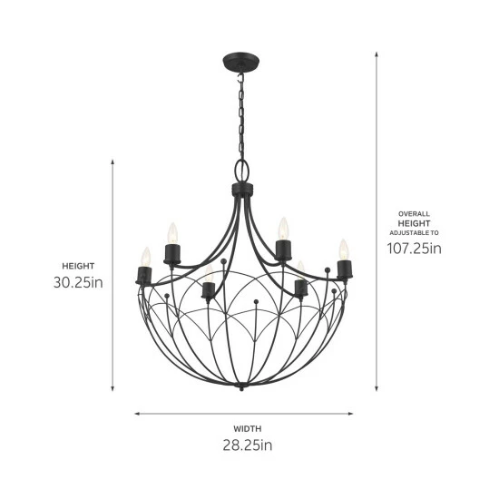 - Fixture measures 28.0-in diameter x 30.2-in height and can be adjusted to hang up to 107.25-in