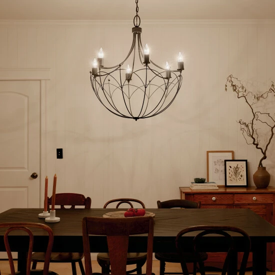 Inspired by botanical gardens and their effortless structures, the Topiary collection captures the elegance of stepping into nature. True to its name, Topiary has a meticulously crafted, unique heirloom appeal. The Topiary 6 light chandelier draws inspiration from the flowing linework seen in vintage planters. Elegant candle sleeves sit atop floral-inspired curves finished in the classic Textured Black. Adjust its chain to a height right for your space.