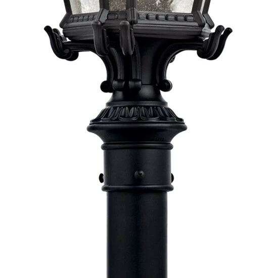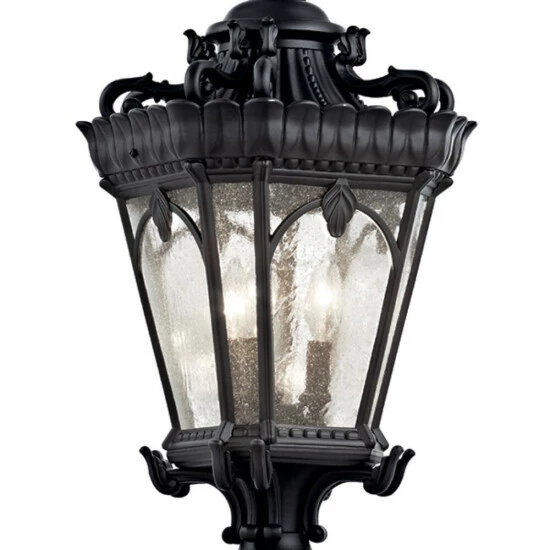 The Tournai 27″ 3 Light outdoor post light features an ornate look with its clear seeded glass and Textured Black finish. The Tournai wall light works in a traditional environment. Capture the Victorian appeal of this intricate design in Textured Black, which so beautifully highlights an abundance of curls and ornate Venetian details. Complements a traditional exterior style. Perfect at an outdoor entryway. Extend a coordinated look throughout your yard with this collection’s other fine fixtures as well, including various wall lights, pendants, and post lanterns. The Tournai 3 light outdoor post light with Textured Black finish and clear seeded glass measures 12″ in width and 27″ in body height. Requires three 60W max candelabra bulbs (not included).