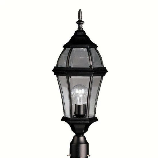 This Townhouse collection 1-light outdoor post lantern features a black finish that will complement many traditional decors. Clean lines and a classic design adds interest while clear beveled glass panels provide ample lighting for your outdoor decor. With its tall and intricate design, the Townhouse collection adds classic form to Kichler’s expansive assortment of decorative outdoor lighting. Made by the finest craftsmen in the industry, each piece is formed from cast aluminum and is U.L. listed for wet location, ensuring these high quality fixtures will continue looking fabulous for years to come. Post not included. Dimensions: 24 inches high x 9.25 inch diameter. Turn on our fixtures, and watch your room transform even more. From lighting to ceiling fans Kichler collections are built around our simple philosophy of bringing you the effect you want for your home or business. Our collections coordinate from room-to-room, or let you mix and match from wall-to-ceiling. And each fixture is designed to deliver a stunning quality of light that makes your space more beautiful and more livable. As one of the largest, privately held residential lighting fixture companies in North America, we’re constantly working to create innovative and on-trend decorative products as well as knowledgeable support. Since 1938, we’ve been creating products that are not only well designed, but also practical. We invest millions of dollars each year in design, technology and testing to assure that we’re offering distributors, designers, installers and homeowners not only innovative technologies – but also fixtures that perform efficiently, install intuitively and deliver a premium source of light. This philosophy holds true for everything we create – from our wide variety of decorative fixtures to our award-winning landscape lighting to our ceiling fans.