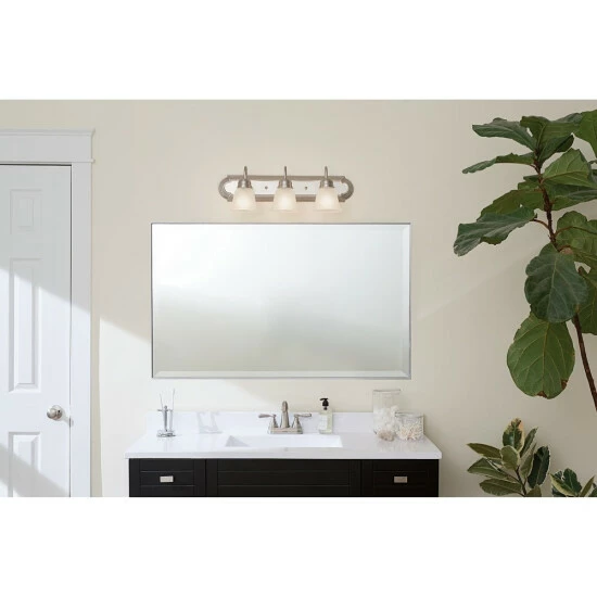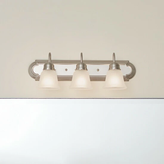 This 3-light bath/vanity light features a brushed nickel finish that will complement many traditional decors. Clean lines of the steel frame add interest while satin etched glass shades soften the light to create a warm ambiance for any bathroom or vanity space.