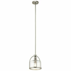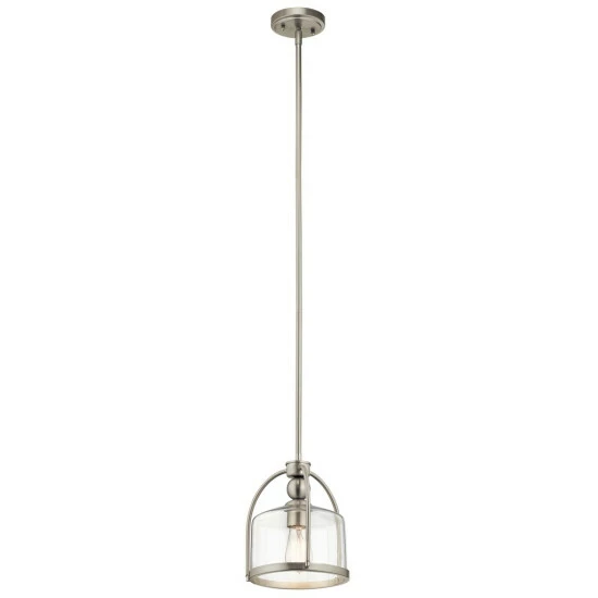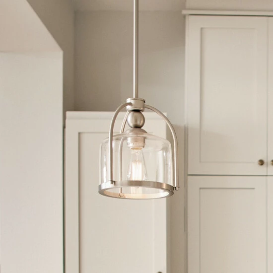 This 1-light mini pendant features a brushed nickel finish that will complement many transitional decors. The clean lines of the cage housing the clear glass shade adds interest while providing uninterrupted light to any space.