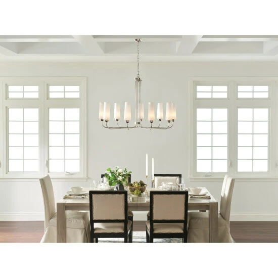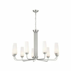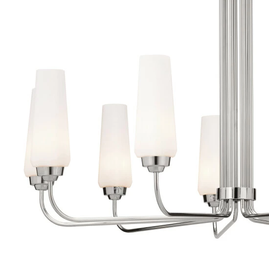 Long arms, curved features, and a hint of the industrial make the Truby collection a contemporary design favorite. The Truby 9 light chandelier illuminates through aerodynamic-inspired arms made of Satin Etched Cased Opal Glass. With a Polishd Nickel finish, this fixture pulls from yesterday to enlighten today