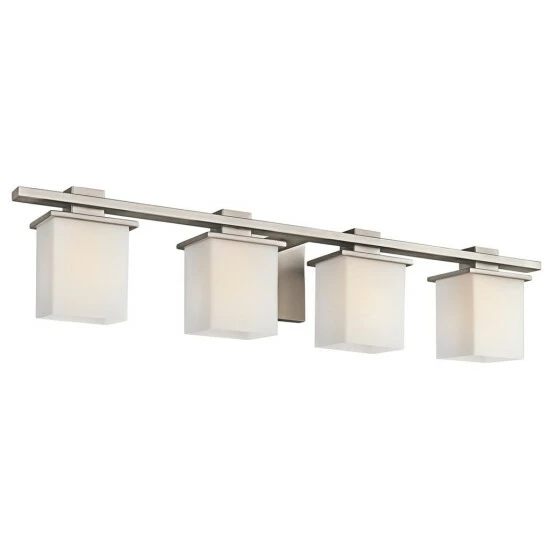 This 4-light bath/vanity fixture from the Tully collection features an antique pewter finish that will complement many transitional decors. The smooth lines of the steel frame add interest while cube shaped satin etched cased opal glass soften the light. The Tully(TM) collection creates a pleasing flow in any bathroom or vanity space. Characterized by clean lines and a simple cubic design, it provides an airy, uncluttered feel with an understated, contemporary flair. Featuring an antique pewter finish with satin etched cased opal glass, this composition blends effortlessly with existing decor while still leaving a unique impression. May be installed with glass up or down. Dimensions: 6.5 inches high x 32 inches wide x 6.75 inches deep. Turn on our fixtures, and watch your room transform even more. From lighting to ceiling fans Kichler collections are built around our simple philosophy of bringing you the effect you want for your home or business. Our collections coordinate from room-to-room, or let you mix and match from wall-to-ceiling. And each fixture is designed to deliver a stunning quality of light that makes your space more beautiful and more livable. As one of the largest, privately held residential lighting fixture companies in North America, we’re constantly working to create innovative and on-trend decorative products as well as knowledgeable support. Since 1938, we’ve been creating products that are not only well designed, but also practical. We invest millions of dollars each year in design, technology and testing to assure that we’re offering distributors, designers, installers and homeowners not only innovative technologies – but also fixtures that perform efficiently, install intuitively and deliver a premium source of light. This philosophy holds true for everything we create – from our wide variety of decorative fixtures to our award-winning landscape lighting to our ceiling fans.