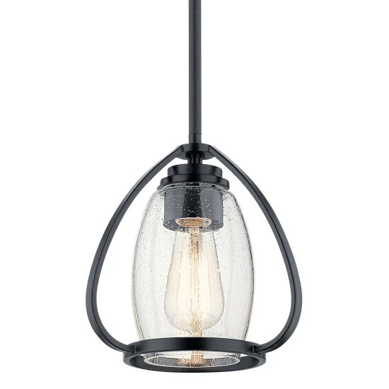 - 8.75″, one light mini pendant with tumbler shaped clear seeded glass and Black finish.