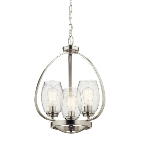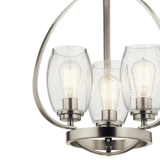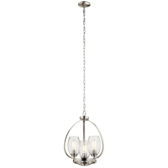 - 21″, three light mini chandelier with tumbler shaped clear seeded glass and Brushed Nickel finish.