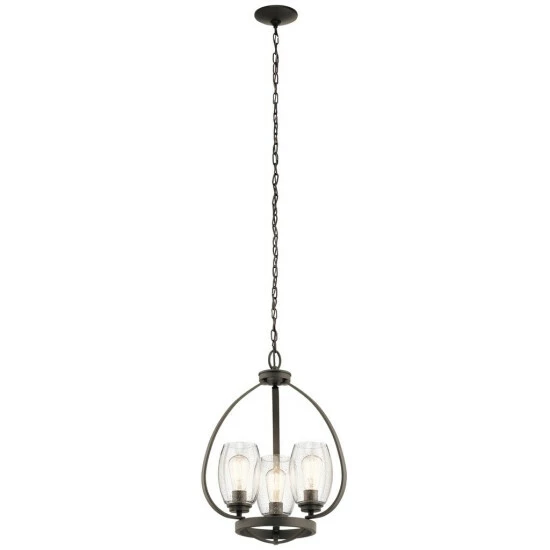 This Tuscany collection 3-light mini chandelier features an olde bronze finish that will complement many lodge, country, and rustic decors. The clean lines of steel frame add interest while the clear seeded glass shades allow the light to bounce in different ways making this piece perfect for any space.