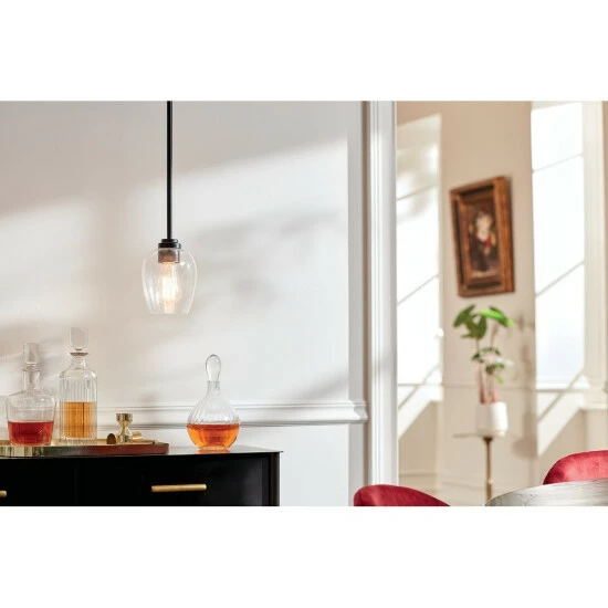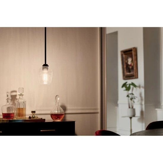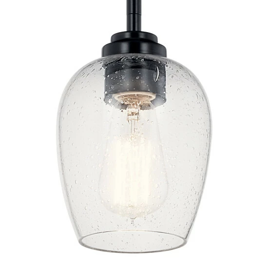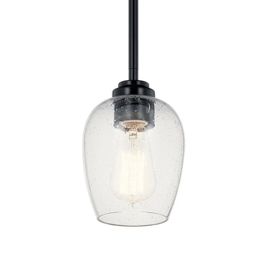 The Valserrano 7.75 inch 1 light mini pendant features wine goblet shaped clear seeded glass shades with a clean design in a Black finish. A perfect addition in several aesthetic environments including transitional, updated traditional or farmhouse decor.