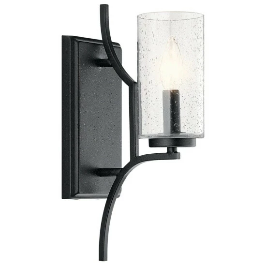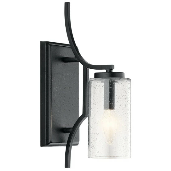 This Vara collection 1-light wall sconce features a distressed black finish that will complement many arts/crafts and mission decors. Clean lines of the steel frame add interest while the clear seeded glass shade gives a unique look to the light making it a perfect fit for any space.