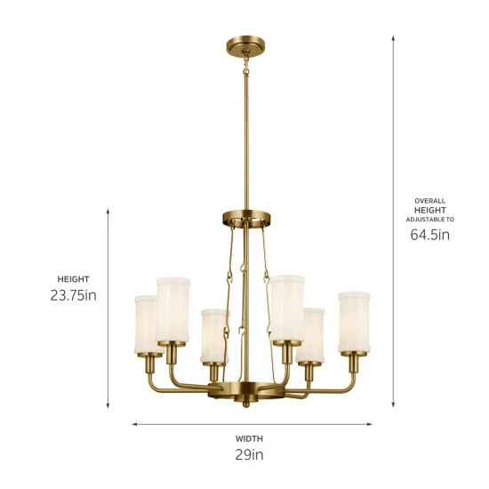- Fixture measures 39.0-in diameter x 23.7-in height and includes multiple stems to hang up to 64.75-in