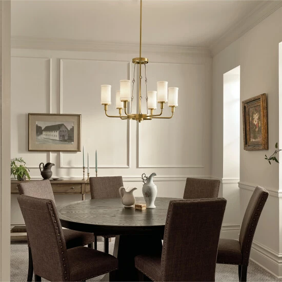 The Vetivene collection whispers nostalgia and redefines distinction. Its exquisite glass and timeless finishes bring your cozy vintage vibe to life. Inspired by vintage herbal drying racks, Vetivene 6 light chandelier’s decorative hooks make the old new again. Its Natural Brass finish elegantly complements its Opal Glass shades. It includes multiple stems to adjust its height and an extra set of candle sleeves, so you can display it without the shades.