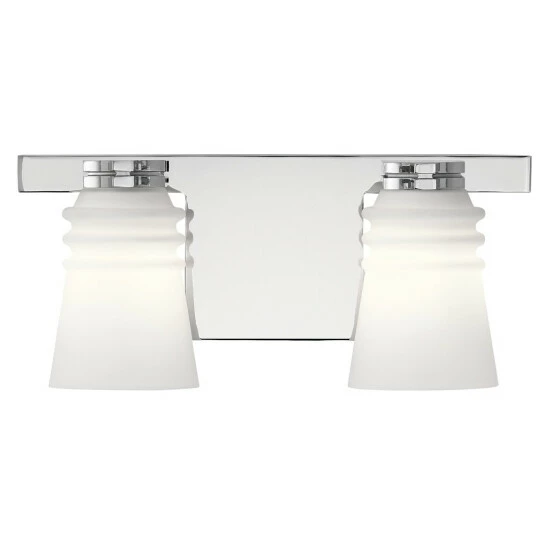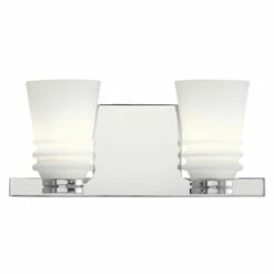 This Victoria collection 2-light bath/vanity fixture features a chrome finish that will complement many transitional decors throughout your home. The clean lines of the steel frame add interest while the satin etched cased opal glass shades soften the light creating an inviting atmosphere to many spaces. With the bath light from the Victoria collection, the frosted glass shades are the star of the show. Threaded details create a rippling effect, while a simple chrome frame provide the foundation. Works beautifully in both traditional and modern decors.