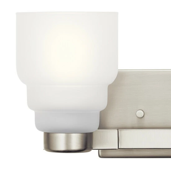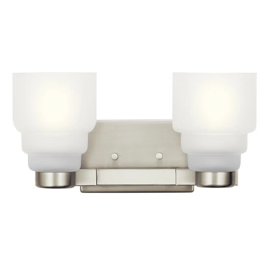 - 14.5″, two light vanity light with satin etched glass and Brushed Nickel finish.