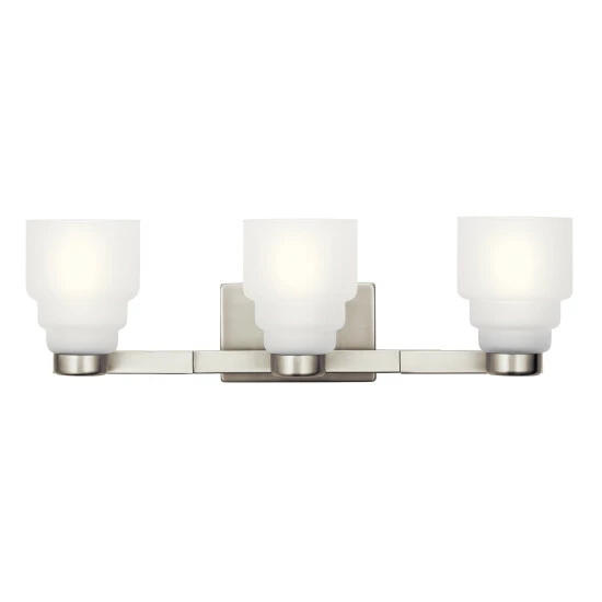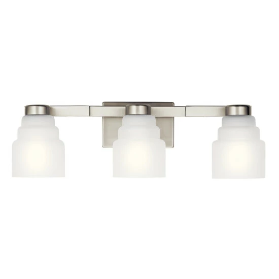 - 24″, three light vanity light with satin etched glass and Brushed Nickel finish.
