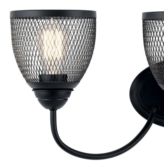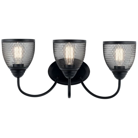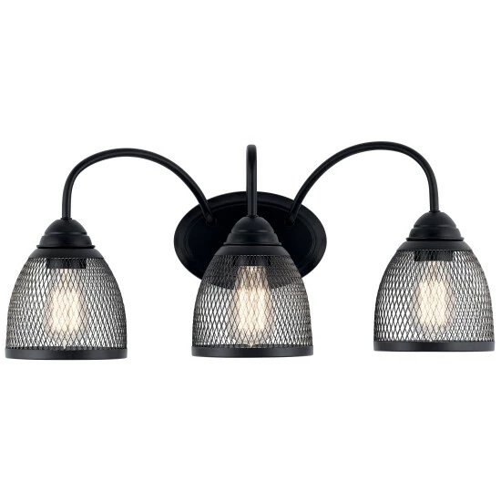 The Voclain 24″ 3 light vanity light features a distinctive industrial look with its Black metal mesh shade. A perfect addition in several aesthetic environments including industrial, contemporary and transitional. The Voclain 3 light vanity light with Black metal mesh shade uses 75 watt (max.) bulb equivalent, measures 24″ in width with a body height of 10.5″.