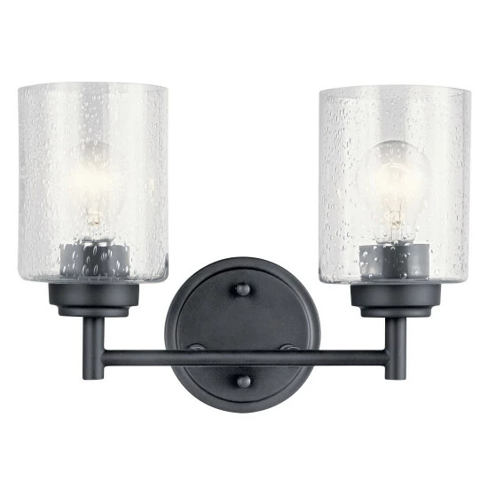 The modern Winslow 2-light 12.75in. bath light in a Black finish with Clear Seeded glass shade pair beautifully with the linear arms, bringing light and dimension to a space.