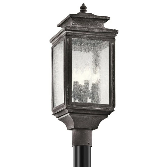 This Wiscombe Park collection 4-light post mount features a weathered zinc finish that will complement many traditional decors. Clean lines of the aluminum frame adds interest while clear seedy glass panels will give your outdoor decor a new look. There is a taste of industrial flair in this traditional outdoor wall fixture from the Wiscombe Park collection. With details reminiscent of old world lanterns the weathered zinc finish is perfectly complemented by the clear seedy glass. Post is not included. Dimensions: 23.25 inches high x 9 inch diameter. Turn on our fixtures, and watch your room transform even more. From lighting to ceiling fans Kichler collections are built around our simple philosophy of bringing you the effect you want for your home or business. Our collections coordinate from room-to-room, or let you mix and match from wall-to-ceiling. And each fixture is designed to deliver a stunning quality of light that makes your space more beautiful and more livable. As one of the largest, privately held residential lighting fixture companies in North America, we’re constantly working to create innovative and on-trend decorative products as well as knowledgeable support. Since 1938, we’ve been creating products that are not only well designed, but also practical. We invest millions of dollars each year in design, technology and testing to assure that we’re offering distributors, designers, installers and homeowners not only innovative technologies – but also fixtures that perform efficiently, install intuitively and deliver a premium source of light. This philosophy holds true for everything we create – from our wide variety of decorative fixtures to our award-winning landscape lighting to our ceiling fans.